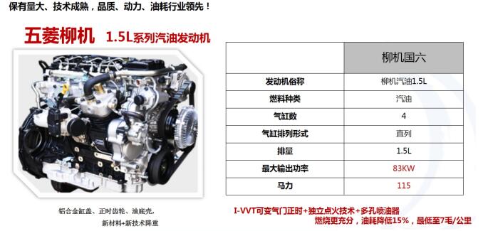 一、動力總成出眾:采用柳機1.5L發(fā)動機,低速大扭矩,配合蒙沃5檔變速箱,性能穩(wěn)定,傳動效率高。